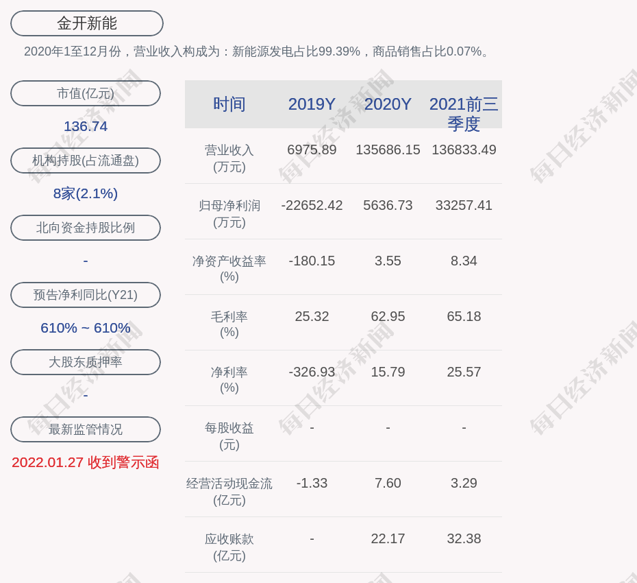 2020年1至12月份(fen),金開新能的營業收入構(gou)成為:新能源發電占(zhan)(zhan)比99.39%,商品銷售占(zhan)(zhan)比0.07%。
