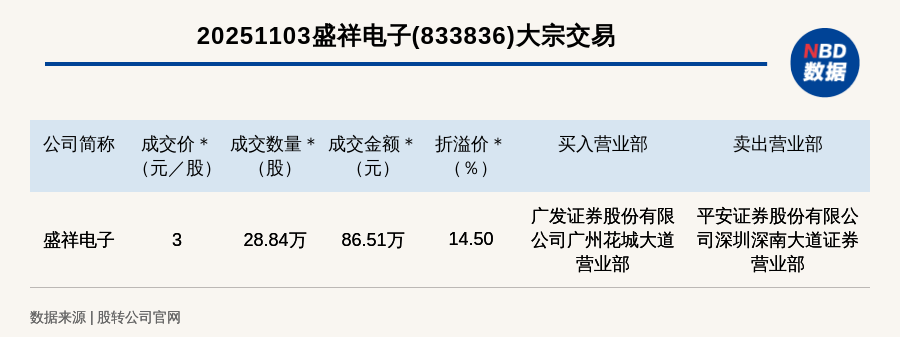 每(mei)經訊,2025年11月3日,新(xin)三板創新(xin)層公(gong)司盛祥電(dian)子(zi)(833836,收盤價:2.62元)發(fa)生一筆(bi)大宗交易,成(cheng)交價3元/股(gu)(gu),成(cheng)交數量28.84萬股(gu)(gu),成(cheng)交金額86.51萬元,溢價14.5%。買入營業(ye)(ye)部(bu)是(shi)廣發(fa)證券股(gu)(gu)份有(you)限公(gong)司廣州花城大道營業(ye)(ye)部(bu),賣出營業(ye)(ye)部(bu)是(shi)平安(an)證券股(gu)(gu)份有(you)限公(gong)司深(shen)圳深(shen)南大道證券營業(ye)(ye)部(bu)。