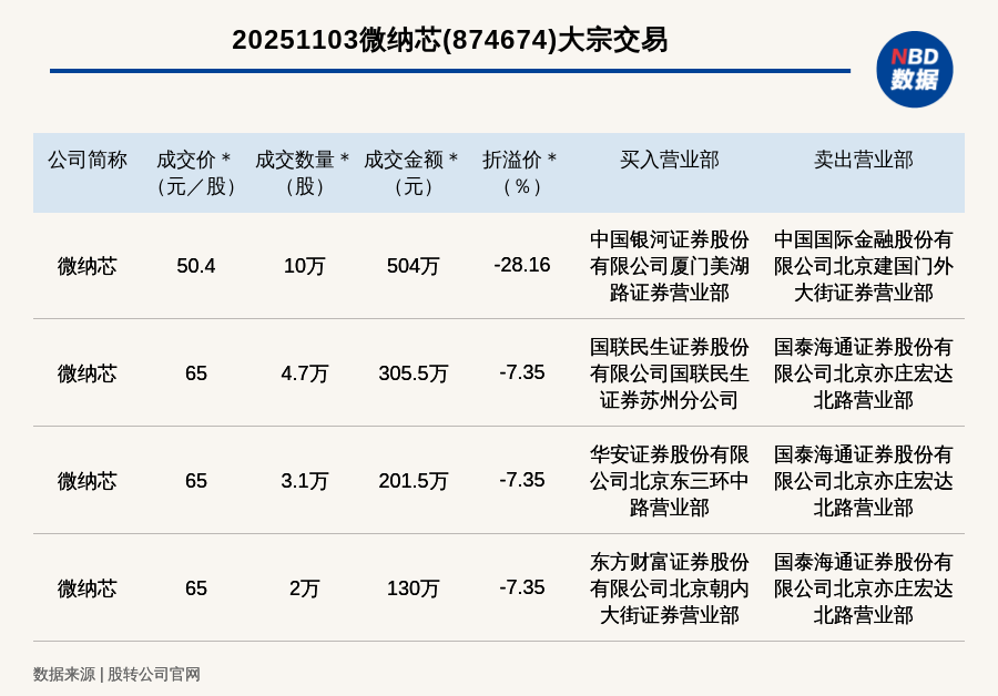 每經訊,2025年11月3日,新(xin)三板創新(xin)層公(gong)司微納(na)芯(874674,收盤價(jia):70.16元(yuan))發生4筆大(da)宗(zong)交(jiao)易,總成(cheng)(cheng)交(jiao)金額為1141萬元(yuan),成(cheng)(cheng)交(jiao)金額最高的一筆成(cheng)(cheng)交(jiao)價(jia)50.4元(yuan)/股(gu),成(cheng)(cheng)交(jiao)數量10萬股(gu),成(cheng)(cheng)交(jiao)金額504萬元(yuan),折價(jia)28.16%。買(mai)入營(ying)業部(bu)是中國(guo)(guo)銀河(he)證(zheng)(zheng)(zheng)券股(gu)份有限(xian)公(gong)司廈門美湖(hu)路證(zheng)(zheng)(zheng)券營(ying)業部(bu),賣出營(ying)業部(bu)是中國(guo)(guo)國(guo)(guo)際金融股(gu)份有限(xian)公(gong)司北京(jing)建國(guo)(guo)門外大(da)街(jie)證(zheng)(zheng)(zheng)券營(ying)業部(bu)。