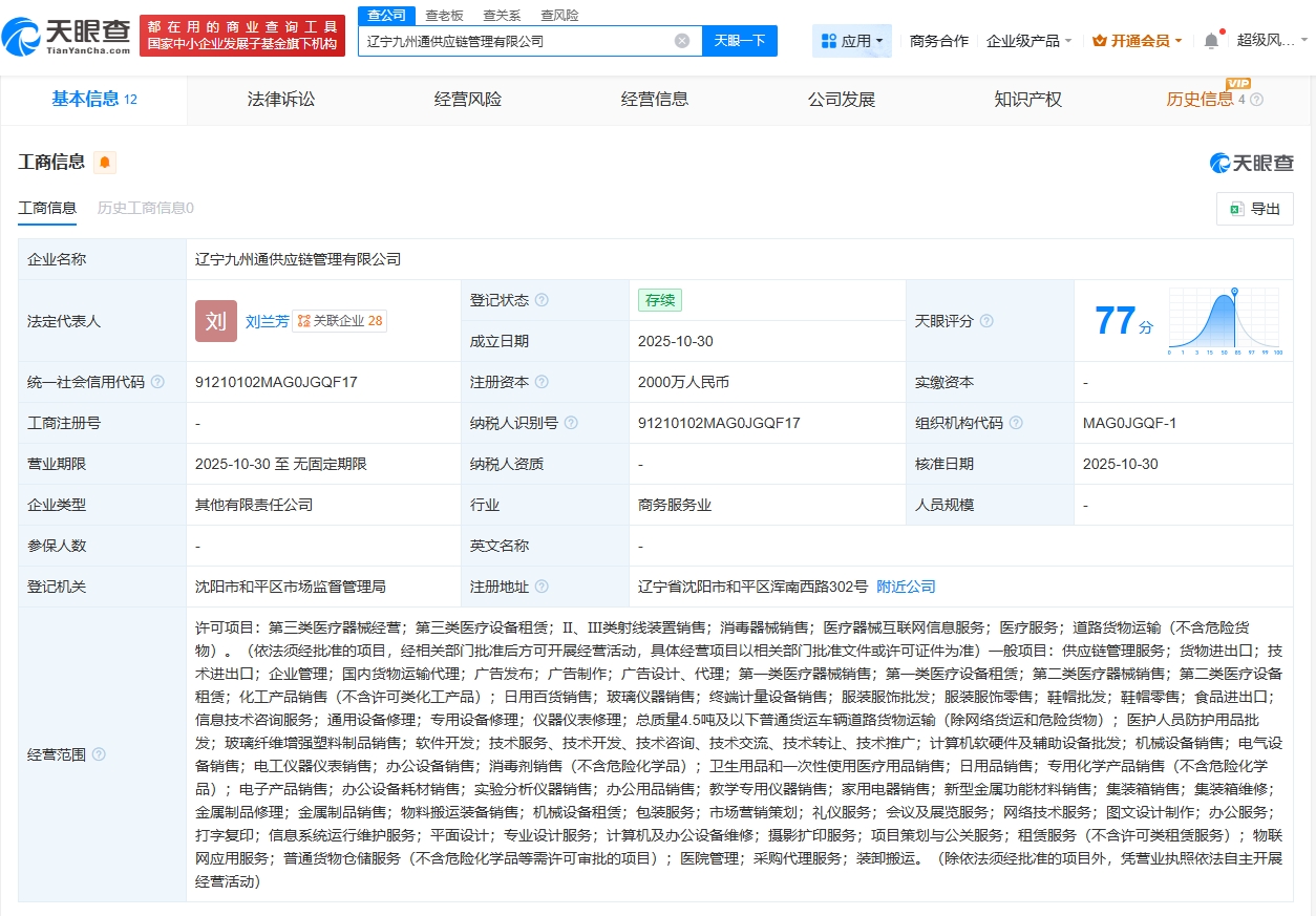 每經(jing)AI快(kuai)訊(xun),天眼查App顯示(shi),近日,遼寧九(jiu)(jiu)州通(tong)供(gong)應(ying)鏈(lian)(lian)管理有(you)限(xian)公(gong)司(si)(si)成立,法定(ding)代表人為劉蘭芳,注(zhu)冊資(zi)本2000萬元(yuan)人民幣,經(jing)營(ying)范(fan)圍包括供(gong)應(ying)鏈(lian)(lian)管理服務(wu)、貨物進出口、第三類醫療器械經(jing)營(ying)等。股東信(xin)息顯示(shi),該公(gong)司(si)(si)由九(jiu)(jiu)州通(tong)醫療器械集(ji)團有(you)限(xian)公(gong)司(si)(si)、沈陽(yang)越榮鑫科技服務(wu)有(you)限(xian)公(gong)司(si)(si)共同持(chi)股。