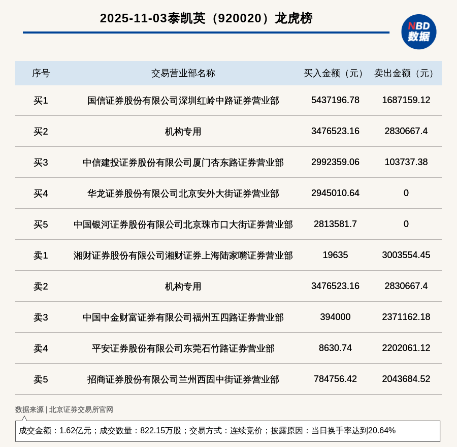 每經訊,2025年11月3日,北交(jiao)所上(shang)市(shi)公(gong)司(si)泰凱英(920020,收盤價:19.65元)登上(shang)龍虎(hu)榜,交(jiao)易方式(shi)是連(lian)續競(jing)價,披露原因是當日換手率達到20.64%,成(cheng)交(jiao)數量822.15萬(wan)股,成(cheng)交(jiao)金額1.62億元。買(mai)一席位(wei)為(wei)國(guo)信(xin)證券股份有限公(gong)司(si)深圳紅嶺中路證券營(ying)業部,買(mai)入543.72萬(wan)元;賣一席位(wei)為(wei)湘財證券股份有限公(gong)司(si)湘財證券上(shang)海陸家嘴證券營(ying)業部,賣出300.36萬(wan)元。