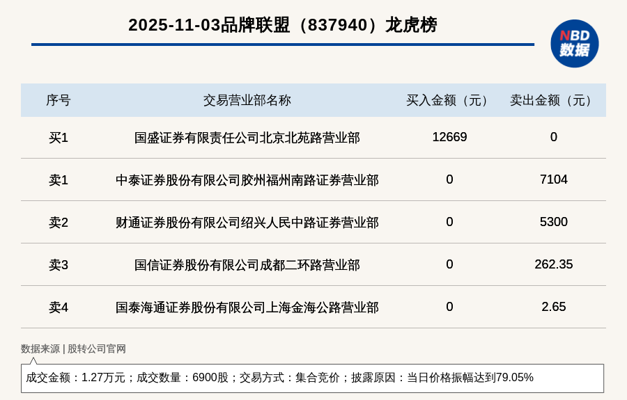 每(mei)經(jing)訊,2025年11月3日(ri),新三板創新層公(gong)司(si)品牌聯(lian)盟(837940,收盤價:2.65元(yuan))登上龍虎榜,交(jiao)易方式是(shi)集(ji)合競價,披露原因(yin)是(shi)當日(ri)價格振幅(fu)達(da)到79.05%,成交(jiao)數量6900股(gu),成交(jiao)金額(e)1.27萬元(yuan)。買(mai)一(yi)席(xi)位(wei)為國盛證(zheng)券(quan)有(you)限(xian)責任公(gong)司(si)北京北苑路(lu)營業(ye)部,買(mai)入1.27萬元(yuan);賣(mai)一(yi)席(xi)位(wei)為中(zhong)泰(tai)證(zheng)券(quan)股(gu)份有(you)限(xian)公(gong)司(si)膠州福州南路(lu)證(zheng)券(quan)營業(ye)部,賣(mai)出7104元(yuan)。
