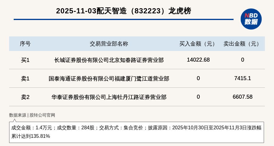 每經(jing)訊,2025年(nian)11月3日,新(xin)三板創新(xin)層(ceng)公(gong)司(si)配(pei)天智造(832223,收盤價:77.77元(yuan))登上龍虎榜(bang),交易方式是集(ji)合競(jing)價,披(pi)露(lu)原因是2025年(nian)10月30日至2025年(nian)11月3日漲跌(die)幅累計達到135.81%,成交數量(liang)284股(gu),成交金額1.4萬(wan)元(yuan)。買(mai)一席位(wei)為長城證券股(gu)份有(you)限(xian)公(gong)司(si)北京知(zhi)春路證券營業部,買(mai)入1.4萬(wan)元(yuan);賣一席位(wei)為國泰海通(tong)證券股(gu)份有(you)限(xian)公(gong)司(si)福建(jian)廈門鷺江道營業部,賣出(chu)7415.1元(yuan)。