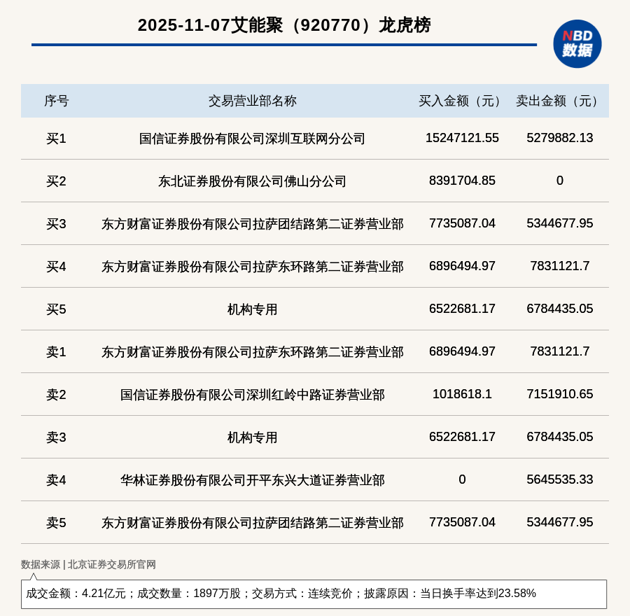 每經訊,2025年(nian)11月7日,北交所(suo)上市公(gong)司艾能聚(920770,收盤(pan)價(jia)(jia):21.68元)登上龍虎榜,交易(yi)方(fang)式是連續(xu)競價(jia)(jia),披(pi)露原因是當(dang)日換手率達到23.58%,成(cheng)交數量(liang)1897萬(wan)(wan)股(gu)(gu),成(cheng)交金(jin)額(e)4.21億元。買一(yi)席位為國(guo)信證券(quan)(quan)股(gu)(gu)份有(you)限(xian)公(gong)司深(shen)圳互聯網分公(gong)司,買入1524.71萬(wan)(wan)元;賣一(yi)席位為東方(fang)財富證券(quan)(quan)股(gu)(gu)份有(you)限(xian)公(gong)司拉薩東環路第二證券(quan)(quan)營業(ye)部,賣出783.11萬(wan)(wan)元。