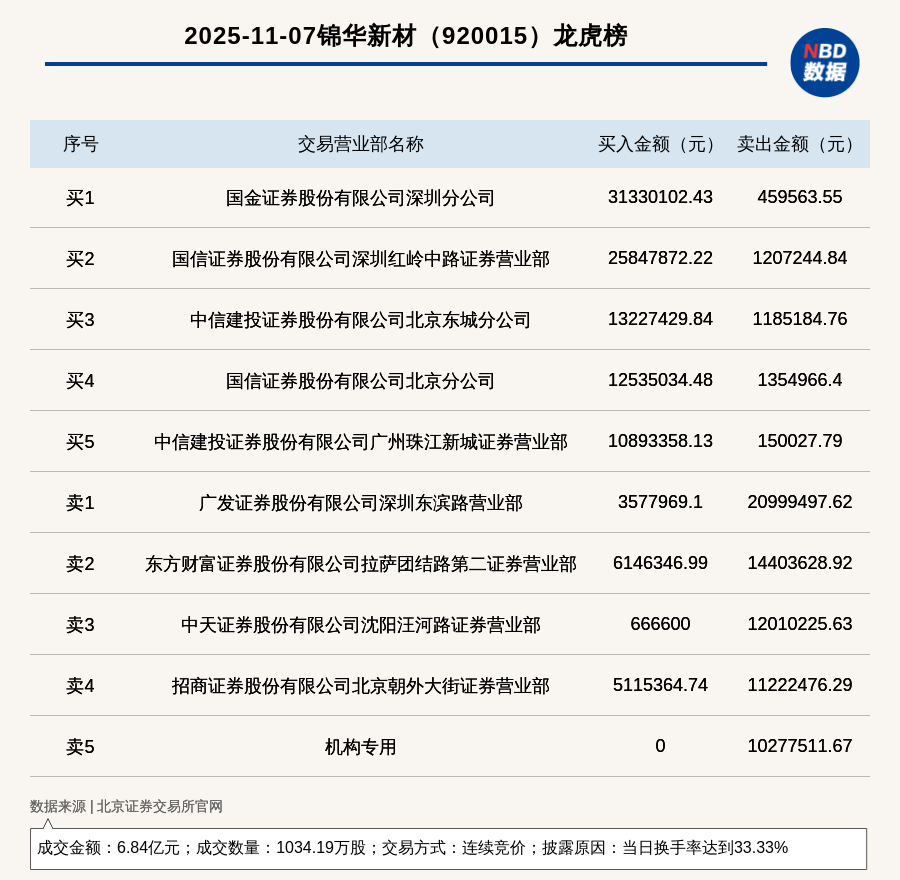每(mei)經訊,2025年(nian)11月7日(ri),北交(jiao)所上市(shi)公司(si)錦華新材(920015,收盤價(jia):66.69元(yuan))登上龍虎榜,交(jiao)易方式是(shi)連(lian)續競價(jia),披露原因是(shi)當日(ri)換手率達到33.33%,成交(jiao)數量1034.19萬股(gu),成交(jiao)金(jin)額6.84億元(yuan)。買一席位為國金(jin)證券(quan)股(gu)份有限(xian)公司(si)深圳(zhen)分公司(si),買入3133.01萬元(yuan);賣一席位為廣發(fa)證券(quan)股(gu)份有限(xian)公司(si)深圳(zhen)東濱路營業部,賣出2099.95萬元(yuan)。