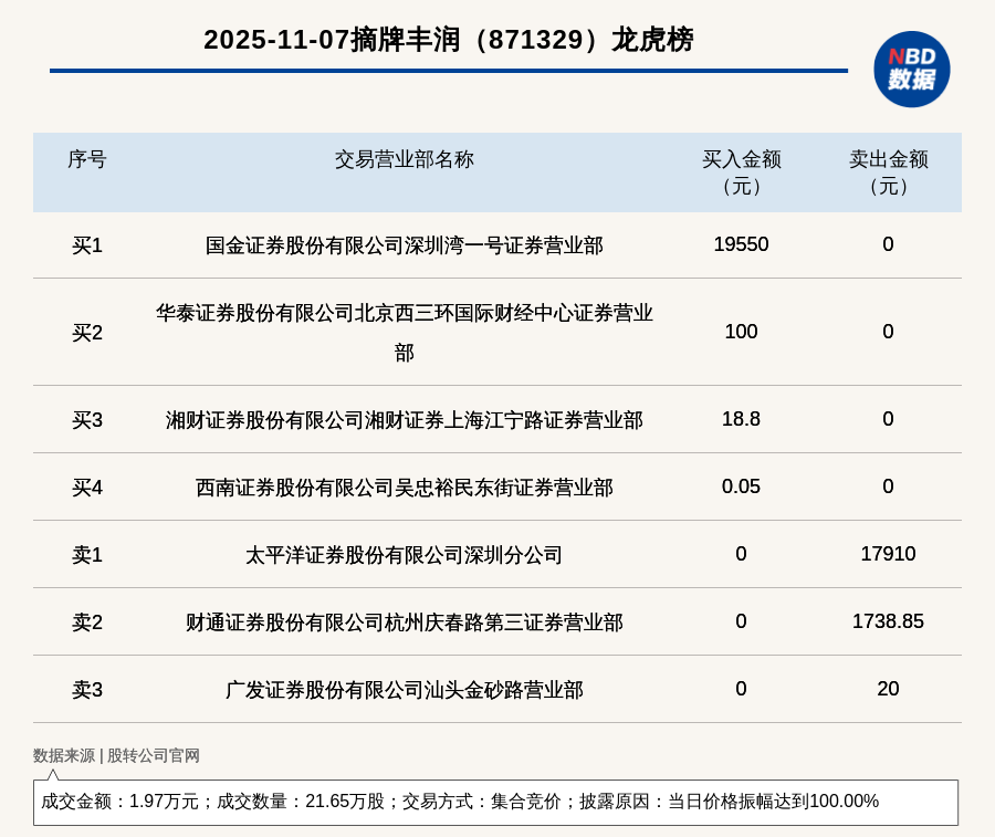 每經訊,2025年11月7日(ri),新三板基礎層公司摘牌豐潤(871329,收盤(pan)價:0.1元(yuan))登上龍虎榜,交易方式是集合競價,披(pi)露原因(yin)是當(dang)日(ri)價格振(zhen)幅達(da)到100.00%,成交數量21.65萬(wan)(wan)股,成交金額1.97萬(wan)(wan)元(yuan)。買(mai)一席(xi)位為(wei)國金證券(quan)股份有限公司深圳灣一號證券(quan)營業部,買(mai)入1.96萬(wan)(wan)元(yuan);賣一席(xi)位為(wei)太平洋證券(quan)股份有限公司深圳分公司,賣出1.79萬(wan)(wan)元(yuan)。
