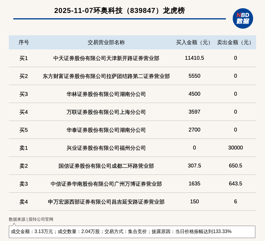 每經訊,2025年11月7日,新三板創新層(ceng)公(gong)司(si)環奧科技(839847,收盤價:3元(yuan))登(deng)上龍(long)虎榜,交(jiao)易方式是(shi)集(ji)合競(jing)價,披露原因是(shi)當(dang)日價格振幅達到(dao)133.33%,成交(jiao)數量2.04萬股(gu),成交(jiao)金額3.13萬元(yuan)。買一(yi)席(xi)位為(wei)中天證(zheng)券股(gu)份(fen)(fen)有限(xian)公(gong)司(si)天津新開路證(zheng)券營業(ye)部,買入1.14萬元(yuan);賣(mai)一(yi)席(xi)位為(wei)興業(ye)證(zheng)券股(gu)份(fen)(fen)有限(xian)公(gong)司(si)福(fu)州分公(gong)司(si),賣(mai)出3萬元(yuan)。