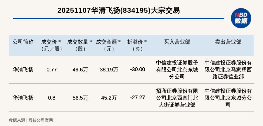 每經訊,2025年11月7日(ri),新三板創新層(ceng)公(gong)司(si)華清飛揚(yang)(834195,收盤(pan)價:1.1元)發生2筆(bi)大(da)宗(zong)交(jiao)易,折(zhe)價率最高(gao)的一筆(bi)成交(jiao)價0.77元/股(gu)(gu),成交(jiao)數(shu)量49.6萬股(gu)(gu),成交(jiao)金額(e)38.19萬元,折(zhe)價30%。買入營(ying)業(ye)(ye)部(bu)(bu)是中(zhong)信(xin)建(jian)(jian)投證(zheng)券(quan)股(gu)(gu)份有(you)(you)限(xian)公(gong)司(si)北京(jing)東城分公(gong)司(si),賣出營(ying)業(ye)(ye)部(bu)(bu)是中(zhong)信(xin)建(jian)(jian)投證(zheng)券(quan)股(gu)(gu)份有(you)(you)限(xian)公(gong)司(si)北京(jing)馬(ma)家(jia)堡西路證(zheng)券(quan)營(ying)業(ye)(ye)部(bu)(bu)。