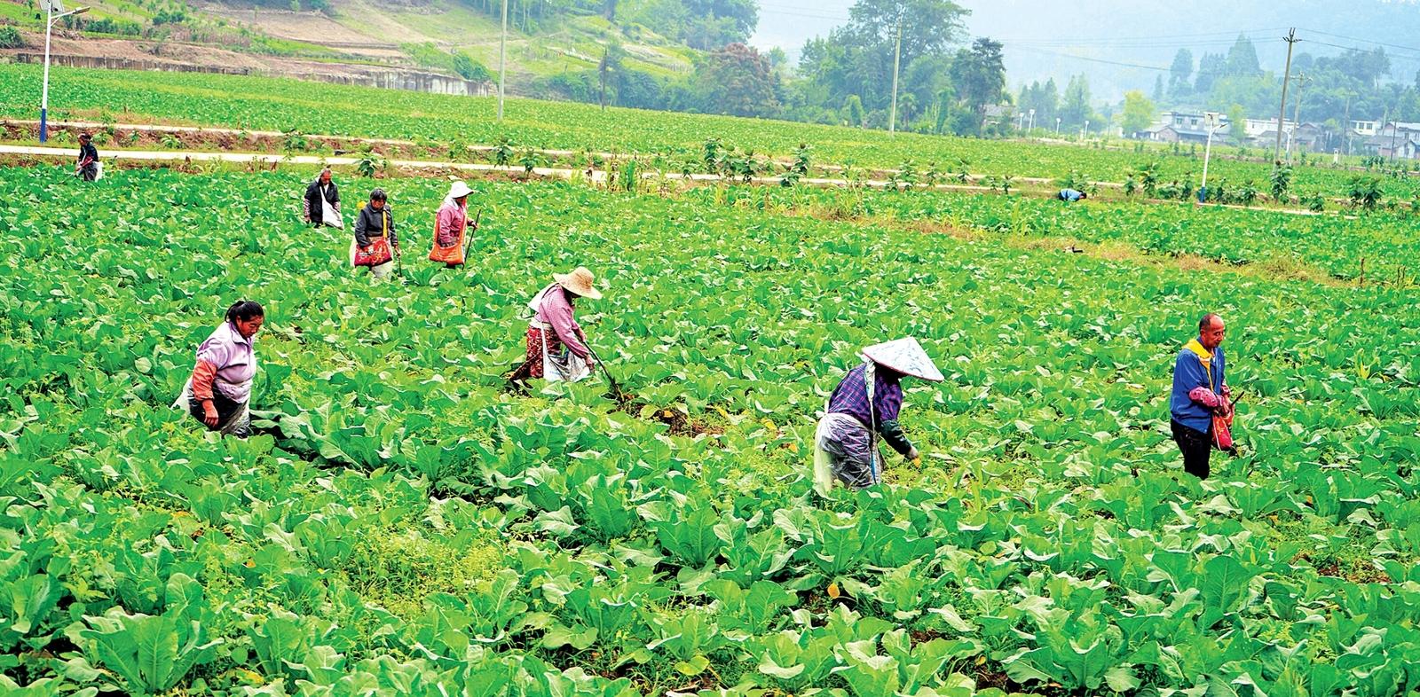 在名山(shan)區萬畝糧經現(xian)代(dai)農業園(yuan)區,800余畝蔬菜基(ji)地綠意盎然(ran),40余名工人分散作業,彎腰除(chu)草、精準追肥,抓緊秋(qiu)冬(dong)管(guan)護關鍵(jian)期,為(wei)穩產(chan)豐收蓄力。