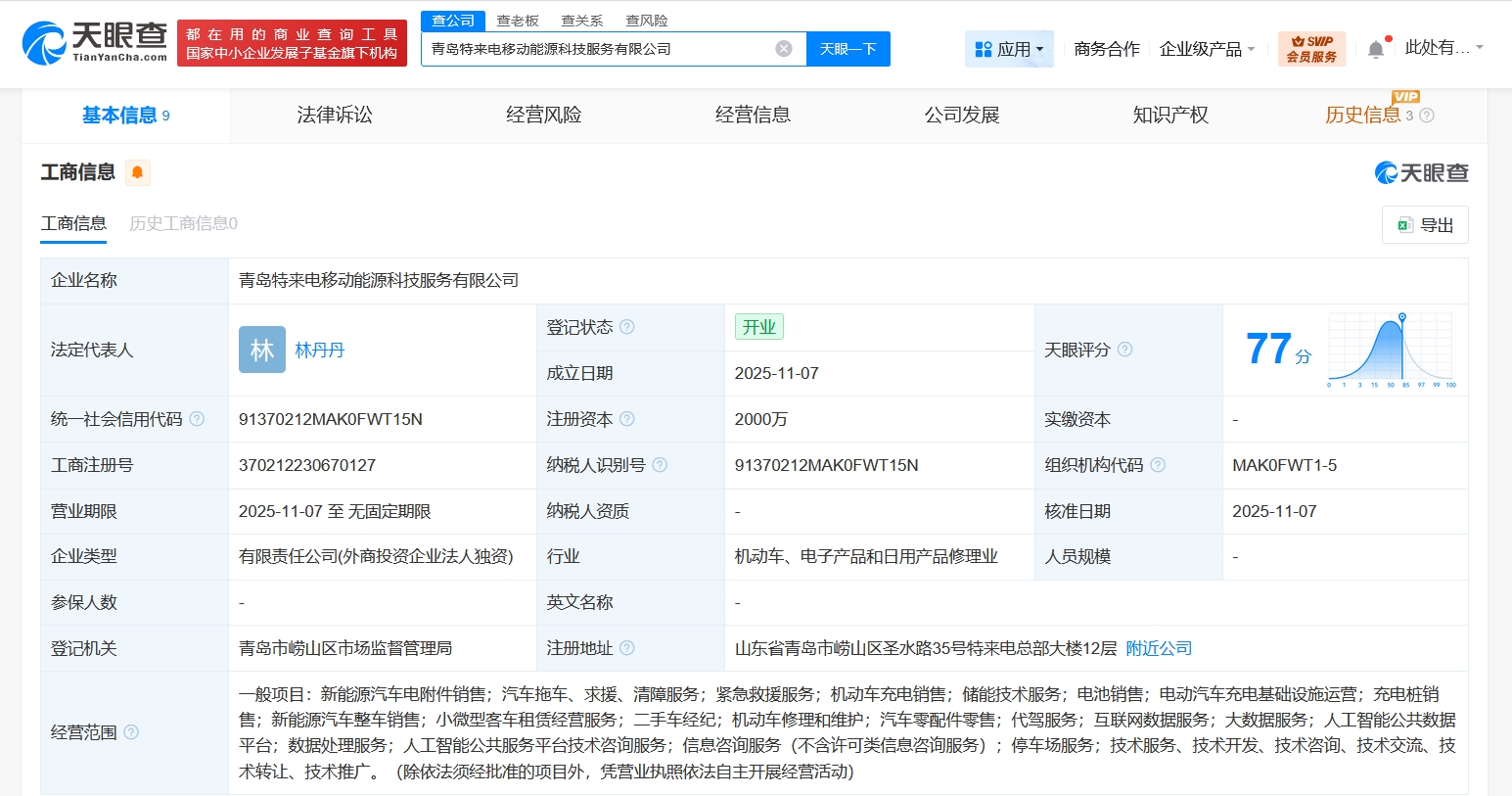 每經(jing)AI快訊,天眼(yan)查(cha)工商信(xin)息(xi)顯示,近(jin)日,青島特來電移動能源(yuan)(yuan)科技服(fu)(fu)務有(you)(you)限(xian)公(gong)司成立,法定(ding)代表人為林(lin)丹丹,注(zhu)冊資本2000萬元人民(min)幣,經(jing)營范圍含(han)新能源(yuan)(yuan)汽車電附(fu)件銷(xiao)售(shou),汽車拖車、求援、清障服(fu)(fu)務,緊急救援服(fu)(fu)務,儲能技術(shu)服(fu)(fu)務,電池銷(xiao)售(shou),電動汽車充電基礎設施(shi)運營,新能源(yuan)(yuan)汽車整車銷(xiao)售(shou),二手車經(jing)紀(ji),人工智(zhi)能公(gong)共數(shu)據平臺,數(shu)據處(chu)理服(fu)(fu)務等。股東信(xin)息(xi)顯示,該公(gong)司由(you)特來電新能源(yuan)(yuan)股份(fen)有(you)(you)限(xian)公(gong)司全資持股。