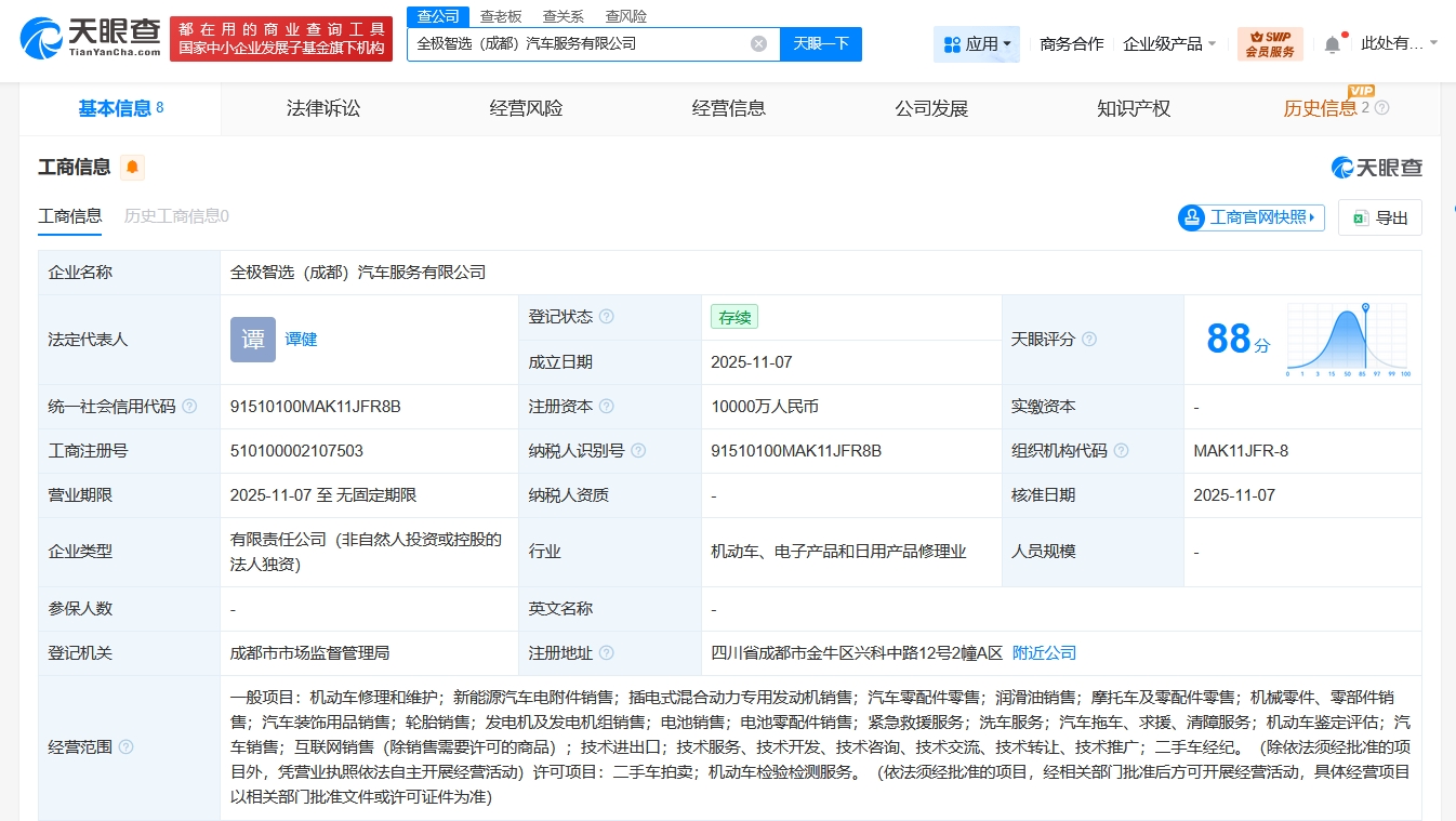 每經(jing)AI快訊,天(tian)眼查工商信(xin)息顯示(shi)(shi),近日,全極智選(xuan)(成都)汽車(che)服(fu)務(wu)有限(xian)公(gong)司成立(li),法定代表人為譚健,注冊資本1億元人民幣(bi),經(jing)營范(fan)圍含機(ji)動(dong)車(che)修理和維(wei)護、新能源汽車(che)電附(fu)件(jian)(jian)銷(xiao)售、插電式混合動(dong)力(li)專用(yong)發動(dong)機(ji)銷(xiao)售、汽車(che)零(ling)配件(jian)(jian)零(ling)售、潤滑油銷(xiao)售、摩托車(che)及(ji)零(ling)配件(jian)(jian)零(ling)售、二手車(che)經(jing)紀(ji)、二手車(che)拍賣(mai)等。股(gu)權(quan)全景穿(chuan)透圖顯示(shi)(shi),該公(gong)司由長城(cheng)智選(xuan)信(xin)息科(ke)技(保定)有限(xian)公(gong)司全資持股(gu),后者(zhe)為長城(cheng)汽車(che)(601633)全資子公(gong)司。