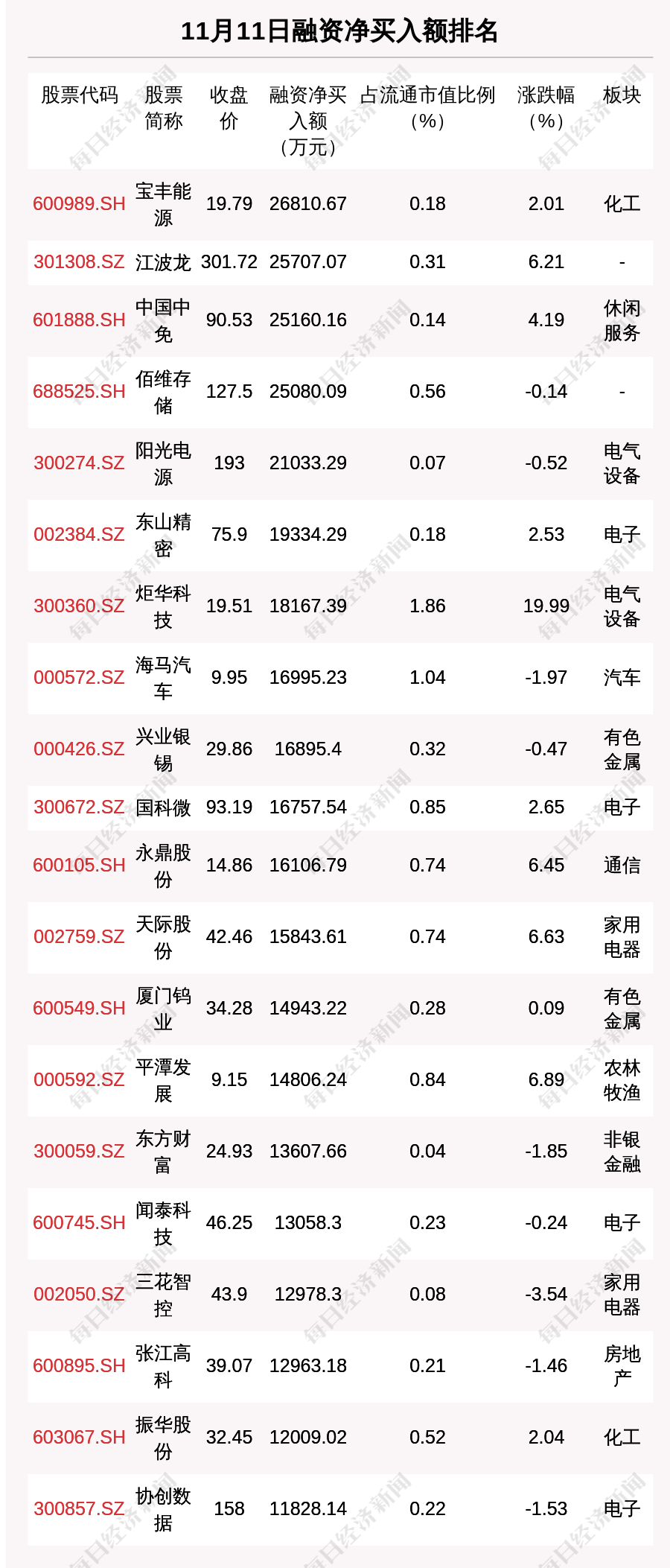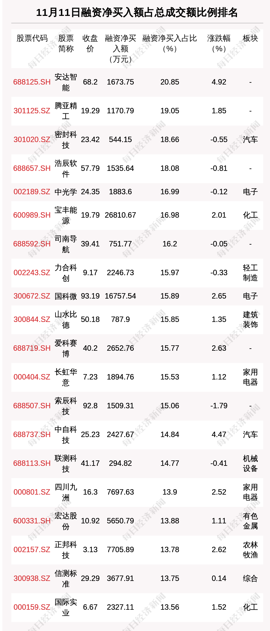 11月11日兩市共(gong)有1694只(zhi)個股有融資(zi)(zi)資(zi)(zi)金凈買入。共(gong)有55只(zhi)股票融資(zi)(zi)凈買入額占總成(cheng)交金額比例超10%,其中安達智能、騰亞(ya)精工、密封(feng)科技排名前三,占比分別為20.85%、19.05%、18.66%。
