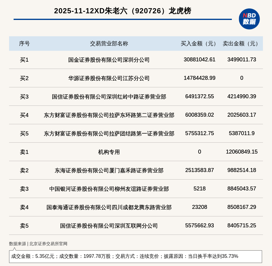 每經訊(xun),2025年11月(yue)12日(ri),北交(jiao)(jiao)所(suo)上市公(gong)(gong)(gong)司(si)XD朱老六(920726,收(shou)盤價:25.12元)登(deng)上龍虎榜,交(jiao)(jiao)易方式是連(lian)續競價,披露原因(yin)是當日(ri)換手率達到35.73%,成交(jiao)(jiao)數量1997.78萬(wan)股(gu),成交(jiao)(jiao)金額5.35億元。買一席位(wei)為國金證券股(gu)份有限公(gong)(gong)(gong)司(si)深圳分公(gong)(gong)(gong)司(si),買入3088.1萬(wan)元;賣一席位(wei)為機構專(zhuan)用,賣出(chu)1206.08萬(wan)元。