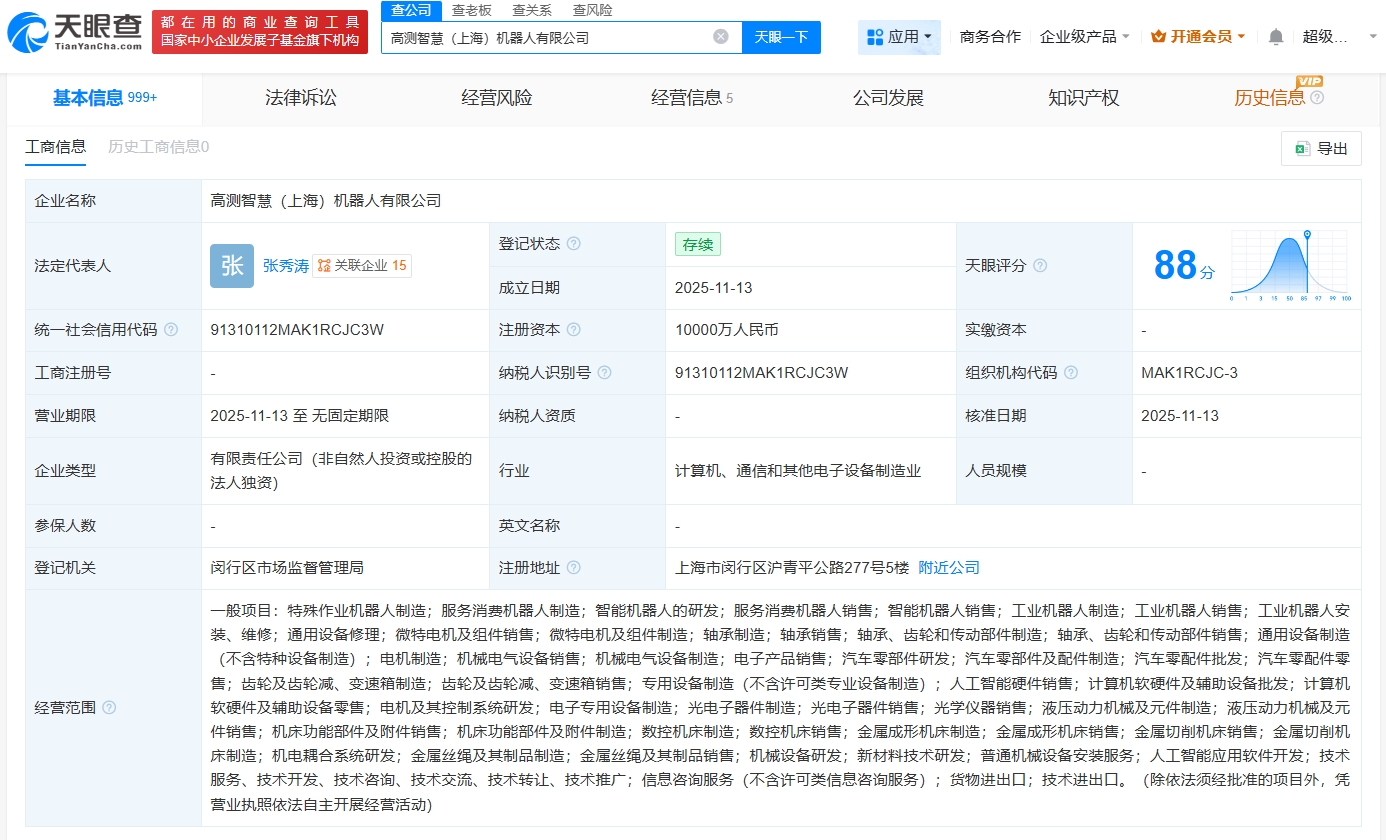 每(mei)經(jing)AI快訊,天眼查App顯(xian)示(shi),近(jin)日,高測(ce)智慧(上海)機(ji)(ji)器人(ren)有限(xian)公(gong)司成立,法定代表人(ren)為張秀濤,注(zhu)冊資本1億元人(ren)民幣,經(jing)營(ying)范圍包括特殊作業(ye)機(ji)(ji)器人(ren)制造、服(fu)(fu)務(wu)消(xiao)費機(ji)(ji)器人(ren)制造、智能機(ji)(ji)器人(ren)的研發(fa)、服(fu)(fu)務(wu)消(xiao)費機(ji)(ji)器人(ren)銷售等(deng)。股權全景穿(chuan)透(tou)圖(tu)顯(xian)示(shi),該(gai)公(gong)司由高測(ce)股份(688556)旗下海南高測(ce)科技有限(xian)公(gong)司全資持股。
