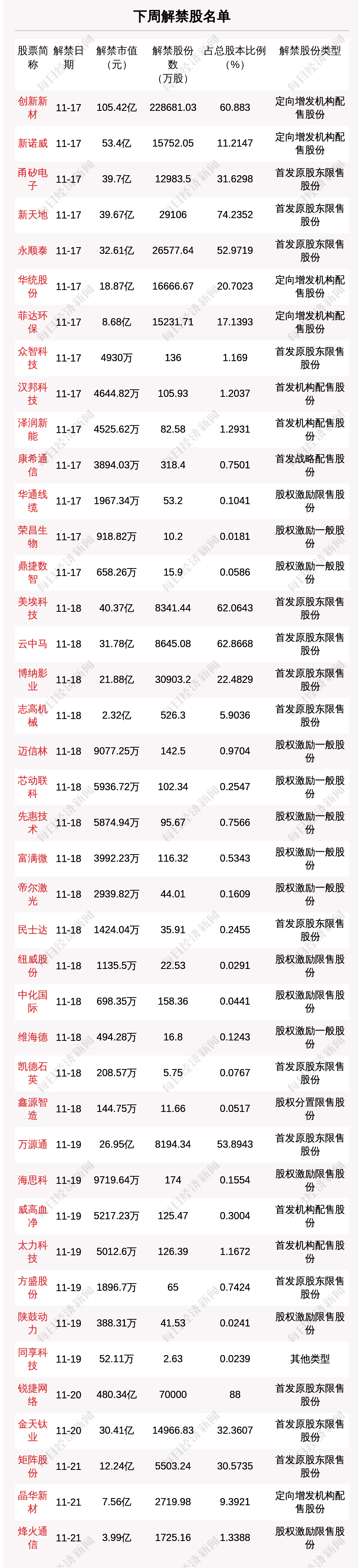 每(mei)經AI快訊,下周(11月17日至11月23日)一(yi)共有(you)41家公司49.85億股限售股解禁(jin),解禁(jin)市值為963.78億元,環比增加628.81億元。