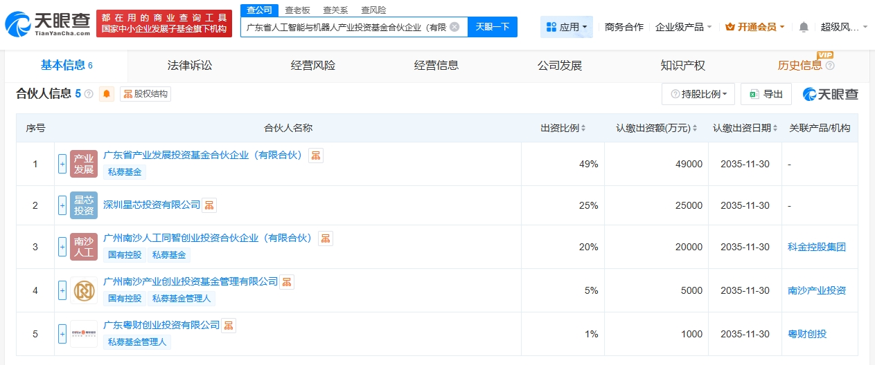 每經(jing)AI快訊(xun),天眼查工(gong)商信息(xi)顯(xian)(xian)示(shi)(shi),近日,廣(guang)(guang)東省人(ren)工(gong)智(zhi)(zhi)能(neng)與機器人(ren)產(chan)業(ye)投(tou)(tou)資(zi)(zi)(zi)基(ji)金合(he)伙(huo)(huo)(huo)(huo)企(qi)業(ye)(有(you)(you)(you)限(xian)(xian)(xian)合(he)伙(huo)(huo)(huo)(huo))成立,執行事務(wu)合(he)伙(huo)(huo)(huo)(huo)人(ren)為廣(guang)(guang)東粵財創(chuang)業(ye)投(tou)(tou)資(zi)(zi)(zi)有(you)(you)(you)限(xian)(xian)(xian)公司(si),出(chu)資(zi)(zi)(zi)額10億元人(ren)民幣,經(jing)營范圍包括以(yi)私募(mu)基(ji)金從事股權投(tou)(tou)資(zi)(zi)(zi)、投(tou)(tou)資(zi)(zi)(zi)管理(li)、資(zi)(zi)(zi)產(chan)管理(li)等活動。合(he)伙(huo)(huo)(huo)(huo)人(ren)信息(xi)顯(xian)(xian)示(shi)(shi),該基(ji)金由廣(guang)(guang)東省產(chan)業(ye)發(fa)展投(tou)(tou)資(zi)(zi)(zi)基(ji)金合(he)伙(huo)(huo)(huo)(huo)企(qi)業(ye)(有(you)(you)(you)限(xian)(xian)(xian)合(he)伙(huo)(huo)(huo)(huo))、深圳星芯(xin)投(tou)(tou)資(zi)(zi)(zi)有(you)(you)(you)限(xian)(xian)(xian)公司(si)、廣(guang)(guang)州南沙人(ren)工(gong)同智(zhi)(zhi)創(chuang)業(ye)投(tou)(tou)資(zi)(zi)(zi)合(he)伙(huo)(huo)(huo)(huo)企(qi)業(ye)(有(you)(you)(you)限(xian)(xian)(xian)合(he)伙(huo)(huo)(huo)(huo))等共同出(chu)資(zi)(zi)(zi)。
