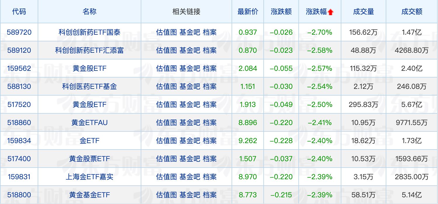 下跌方面,醫藥概念集體下挫,舒泰神、濟民健康等大跌。科創創新藥ETF國泰領跌2.70%,多只黃金相關(guan)ETF回調居前。