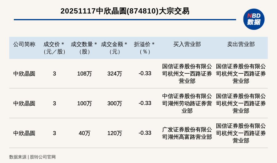 每經訊,2025年11月17日,新三板創新層公司(si)中欣晶圓(874810,收盤價(jia)(jia):3.01元(yuan))發生3筆大宗交易,總成(cheng)交金(jin)額(e)(e)為(wei)744萬元(yuan),成(cheng)交金(jin)額(e)(e)最高的一筆成(cheng)交價(jia)(jia)3元(yuan)/股,成(cheng)交數量108萬股,成(cheng)交金(jin)額(e)(e)324萬元(yuan),折價(jia)(jia)0.33%。買(mai)入營業(ye)部是(shi)國(guo)信證(zheng)券(quan)股份有限(xian)公司(si)杭州文一西(xi)路證(zheng)券(quan)營業(ye)部,賣(mai)出營業(ye)部是(shi)國(guo)信證(zheng)券(quan)股份有限(xian)公司(si)杭州文一西(xi)路證(zheng)券(quan)營業(ye)部。