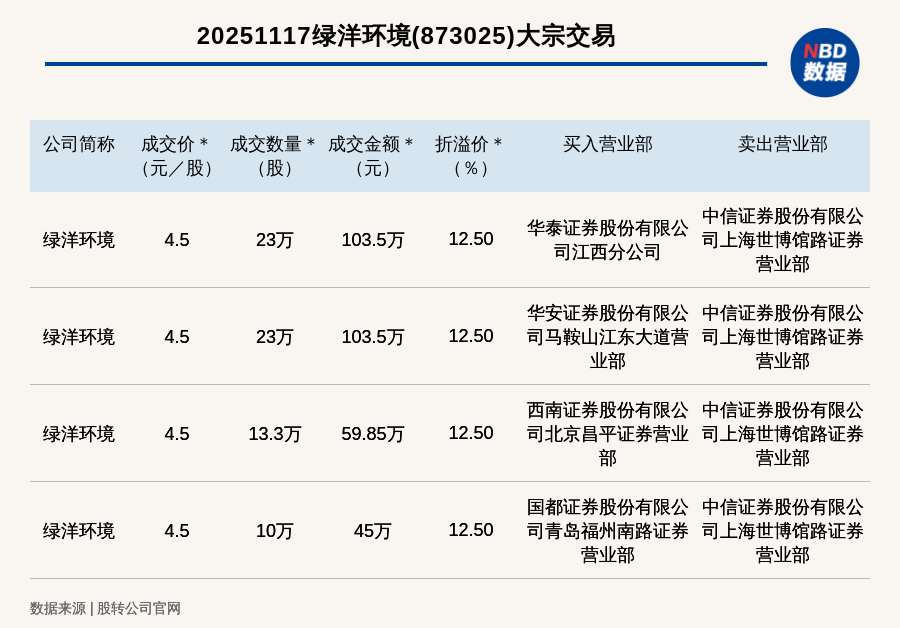 每經訊(xun),2025年(nian)11月(yue)17日,新(xin)三(san)板創新(xin)層公(gong)(gong)(gong)司(si)綠洋環(huan)境(873025,收盤價:4元(yuan))發生4筆(bi)大宗交(jiao)(jiao)易,總成(cheng)交(jiao)(jiao)金額為311.85萬元(yuan),成(cheng)交(jiao)(jiao)金額最高(gao)的一筆(bi)成(cheng)交(jiao)(jiao)價4.5元(yuan)/股,成(cheng)交(jiao)(jiao)數量23萬股,成(cheng)交(jiao)(jiao)金額103.5萬元(yuan),溢價12.5%。買入營(ying)業部(bu)是(shi)華(hua)泰證券股份有(you)限公(gong)(gong)(gong)司(si)江(jiang)西分公(gong)(gong)(gong)司(si),賣出營(ying)業部(bu)是(shi)中信證券股份有(you)限公(gong)(gong)(gong)司(si)上(shang)海世(shi)博館路證券營(ying)業部(bu)。