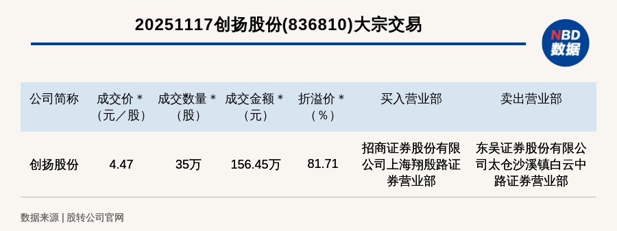 每(mei)經訊,2025年(nian)11月17日,新三板創新層公司創揚股(gu)份(fen)(fen)(836810,收盤(pan)價:2.46元(yuan))發生一(yi)筆大(da)宗交易,成(cheng)交價4.47元(yuan)/股(gu),成(cheng)交數量35萬(wan)股(gu),成(cheng)交金額156.45萬(wan)元(yuan),溢價81.71%。買入(ru)營(ying)業部(bu)(bu)是招商(shang)證(zheng)券(quan)(quan)股(gu)份(fen)(fen)有(you)限(xian)公司上海翔殷路證(zheng)券(quan)(quan)營(ying)業部(bu)(bu),賣(mai)出(chu)營(ying)業部(bu)(bu)是東吳(wu)證(zheng)券(quan)(quan)股(gu)份(fen)(fen)有(you)限(xian)公司太倉沙溪鎮(zhen)白(bai)云(yun)中路證(zheng)券(quan)(quan)營(ying)業部(bu)(bu)。