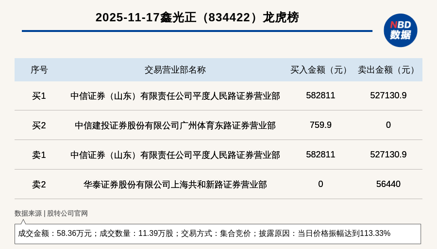 每經(jing)訊,2025年(nian)11月17日,新(xin)三(san)板(ban)創新(xin)層公司(si)鑫光正(834422,收盤價:5.1元)登上龍(long)虎榜,交(jiao)易方(fang)式是集合(he)競價,披露原因是當(dang)日價格振幅達到113.33%,成(cheng)交(jiao)數(shu)量11.39萬(wan)股,成(cheng)交(jiao)金(jin)額58.36萬(wan)元。買一席位為中(zhong)(zhong)信證(zheng)券(山(shan)東(dong)(dong))有(you)限(xian)責任(ren)公司(si)平(ping)度(du)人(ren)民路證(zheng)券營業部(bu),買入58.28萬(wan)元;賣一席位為中(zhong)(zhong)信證(zheng)券(山(shan)東(dong)(dong))有(you)限(xian)責任(ren)公司(si)平(ping)度(du)人(ren)民路證(zheng)券營業部(bu),賣出52.71萬(wan)元。