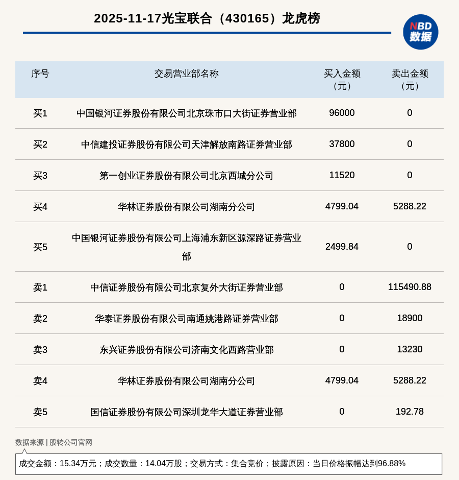 每經訊,2025年11月17日(ri),新(xin)三(san)板基礎層公(gong)司光寶聯合(430165,收盤價(jia):1.89元(yuan))登上龍虎榜,交(jiao)易方式(shi)是集合競價(jia),披露原(yuan)因是當日(ri)價(jia)格振幅達到96.88%,成交(jiao)數(shu)量14.04萬(wan)(wan)股,成交(jiao)金額15.34萬(wan)(wan)元(yuan)。買一席(xi)位為(wei)中國銀(yin)河證券(quan)(quan)股份有限(xian)公(gong)司北(bei)京珠市口(kou)大街(jie)證券(quan)(quan)營業(ye)部(bu),買入9.6萬(wan)(wan)元(yuan);賣(mai)一席(xi)位為(wei)中信證券(quan)(quan)股份有限(xian)公(gong)司北(bei)京復外大街(jie)證券(quan)(quan)營業(ye)部(bu),賣(mai)出(chu)11.55萬(wan)(wan)元(yuan)。