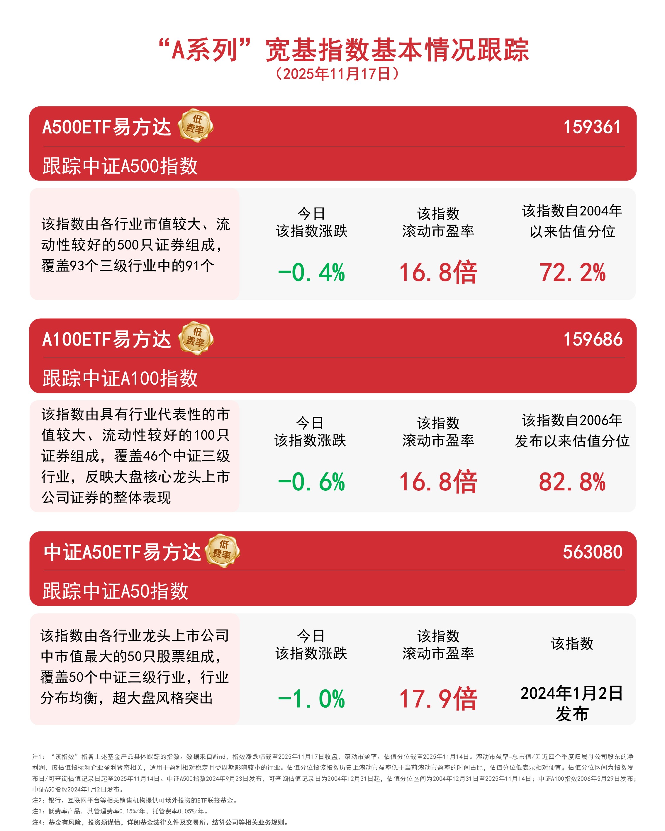 截至(zhi)收盤,中(zhong)(zhong)證(zheng)A500指數下(xia)跌(die)(die)0.4%,中(zhong)(zhong)證(zheng)A100指數下(xia)跌(die)(die)0.6%,中(zhong)(zhong)證(zheng)A50指數下(xia)跌(die)(die)1.0%。