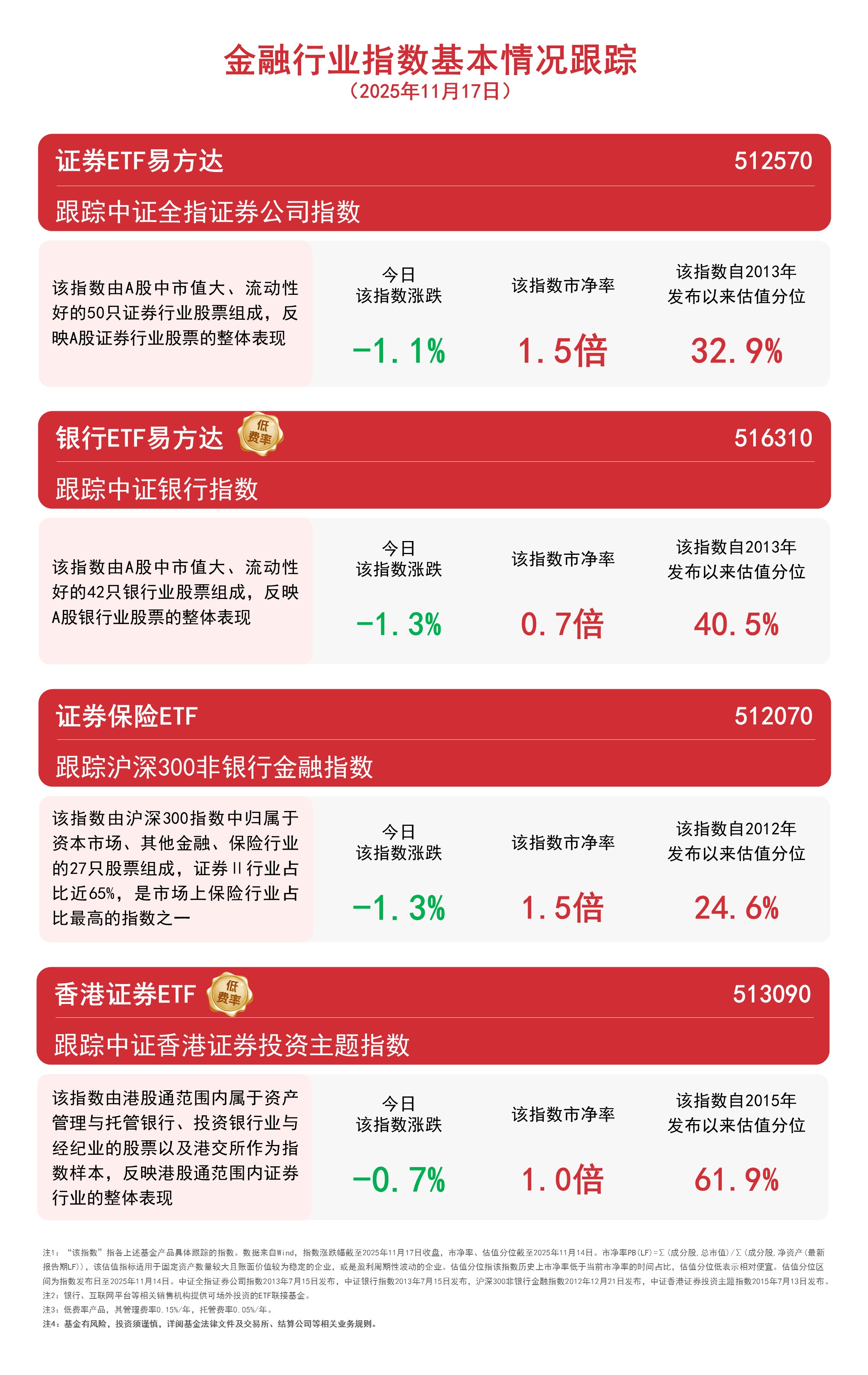 截至收盤,香港證(zheng)券指(zhi)數(shu)下跌0.7%,中證(zheng)全指(zhi)證(zheng)券公司(si)指(zhi)數(shu)下跌1.1%,中證(zheng)銀行(xing)指(zhi)數(shu)、滬(hu)深300非(fei)銀行(xing)金(jin)融指(zhi)數(shu)均下跌1.3%。據(ju)Wind數(shu)據(ju)統計(ji),證(zheng)券保險ETF(512070)11月以來持續獲資(zi)金(jin)凈流入,合計(ji)超22億(yi)元。