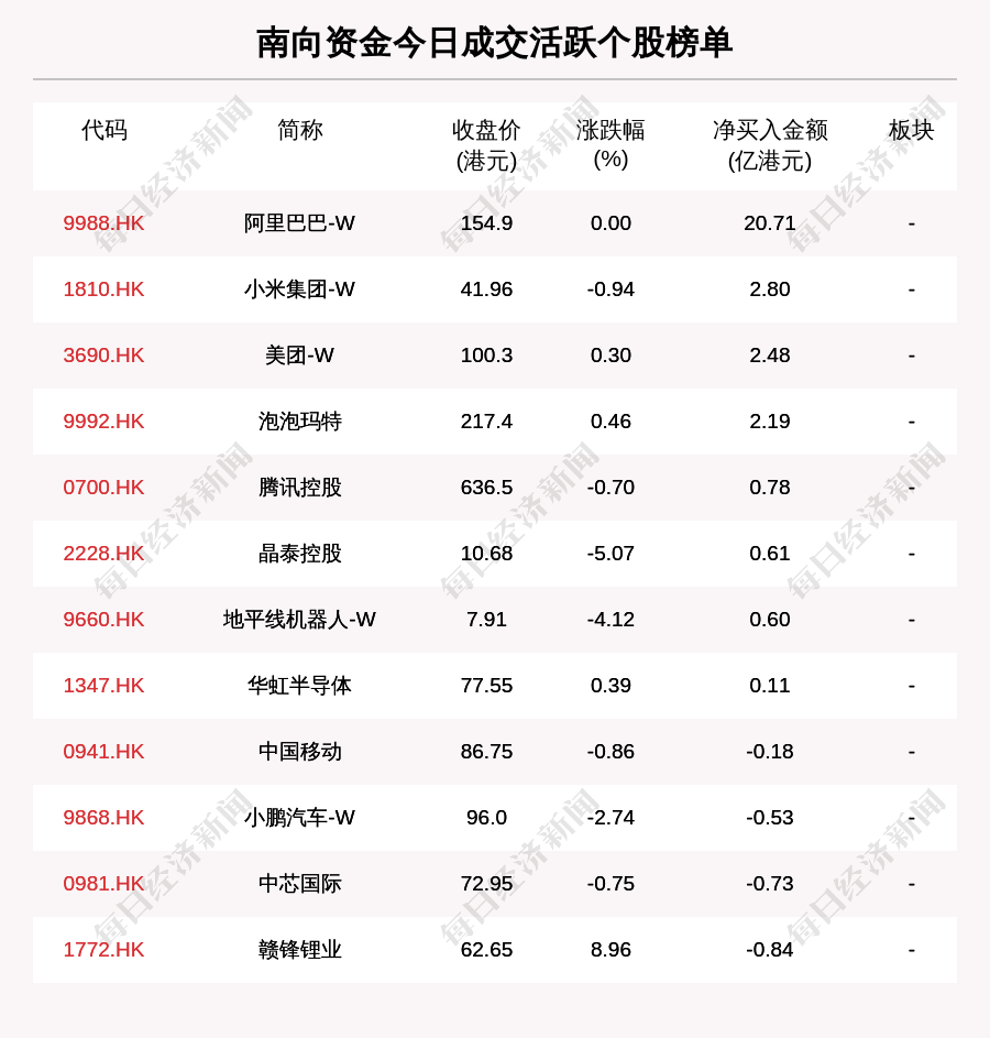 南向資金成交活(huo)躍個股榜(bang)單(dan)中,凈買(mai)入個股共8只(zhi),金額(e)最多的是阿(a)里巴(ba)巴(ba)-W(9988.HK,收盤價:154.9港(gang)元(yuan)),凈買(mai)入20.707億港(gang)元(yuan);凈賣出個股共4只(zhi),金額(e)最多的是贛(gan)鋒鋰業(1772.HK,收盤價:62.65港(gang)元(yuan)),凈賣出0.835億港(gang)元(yuan)。