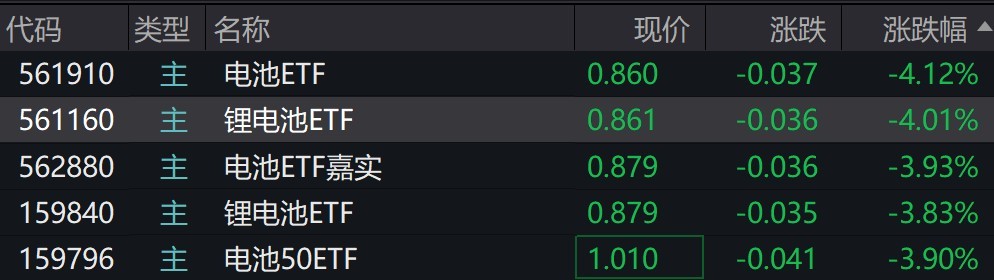 受重倉股下跌影響,多只電池相(xiang)關ETF跌約4%。