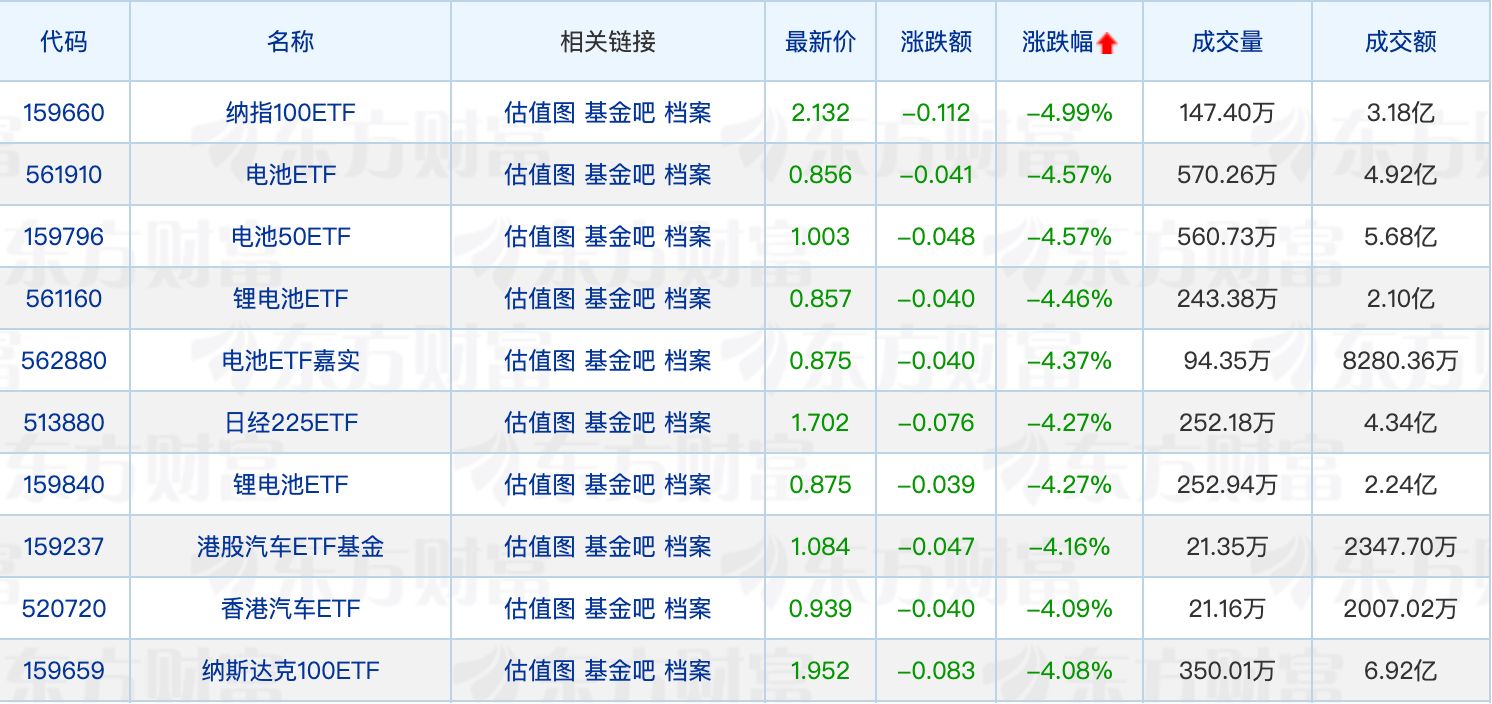 下跌方面(mian),納指100ETF領跌4.99%。鋰(li)電池(chi)板(ban)塊震(zhen)蕩走弱,石大(da)勝華跌停,電池(chi)相關ETF全線回調。