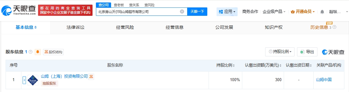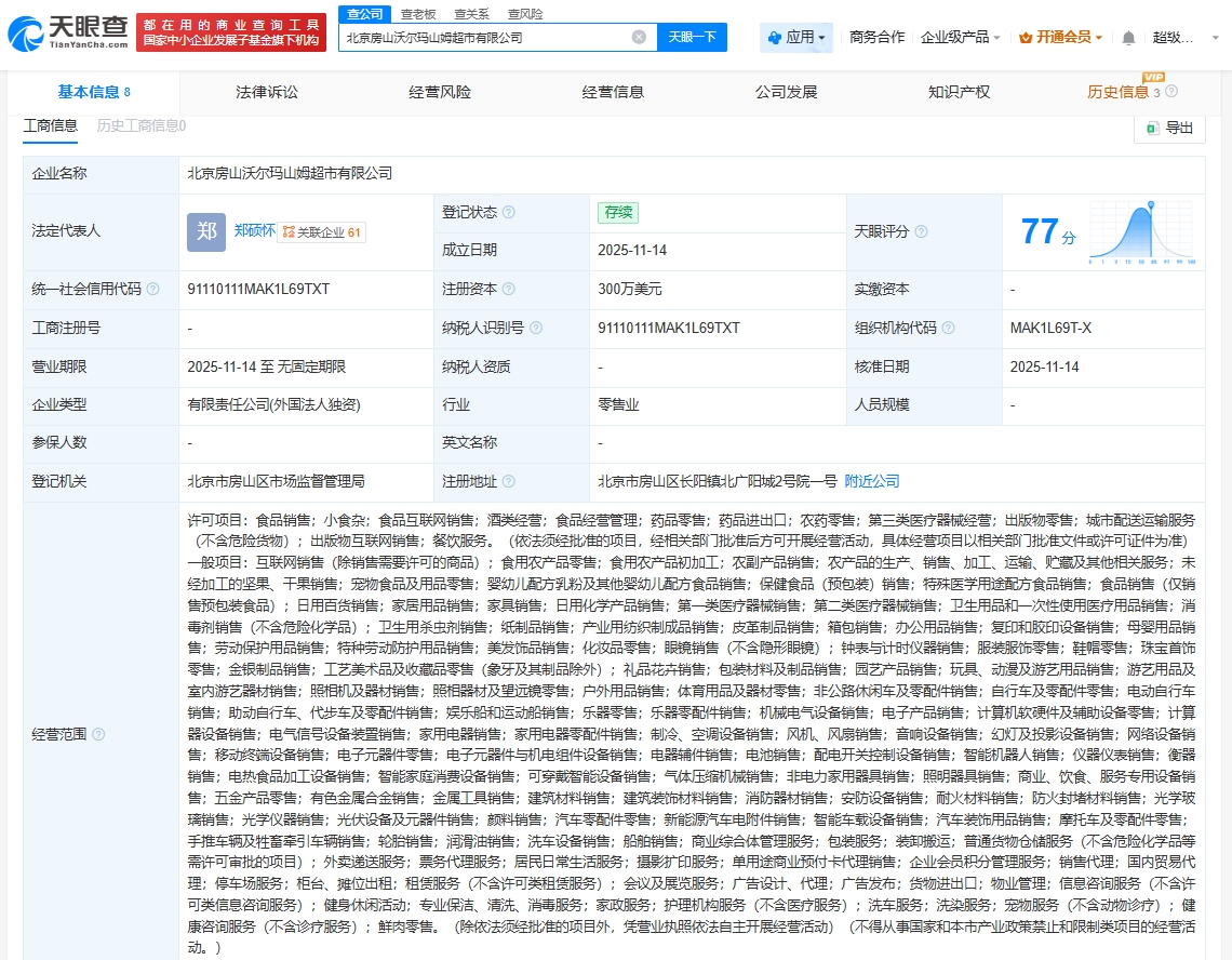 每經(jing)(jing)AI快(kuai)訊,天眼查App顯(xian)示,近日,北京房山沃爾瑪山姆(mu)超(chao)市有(you)限(xian)公(gong)司(si)成(cheng)立,法定代表人(ren)為鄭碩(shuo)懷(huai),注冊資本300萬美元,經(jing)(jing)營(ying)范圍包括食品(pin)互聯網銷售(shou)、酒(jiu)類經(jing)(jing)營(ying)、食品(pin)經(jing)(jing)營(ying)管理(li)、商業綜合(he)體管理(li)服務等。股東信息顯(xian)示,該(gai)公(gong)司(si)由山姆(mu)(上海(hai))投(tou)資有(you)限(xian)公(gong)司(si)全資持股。