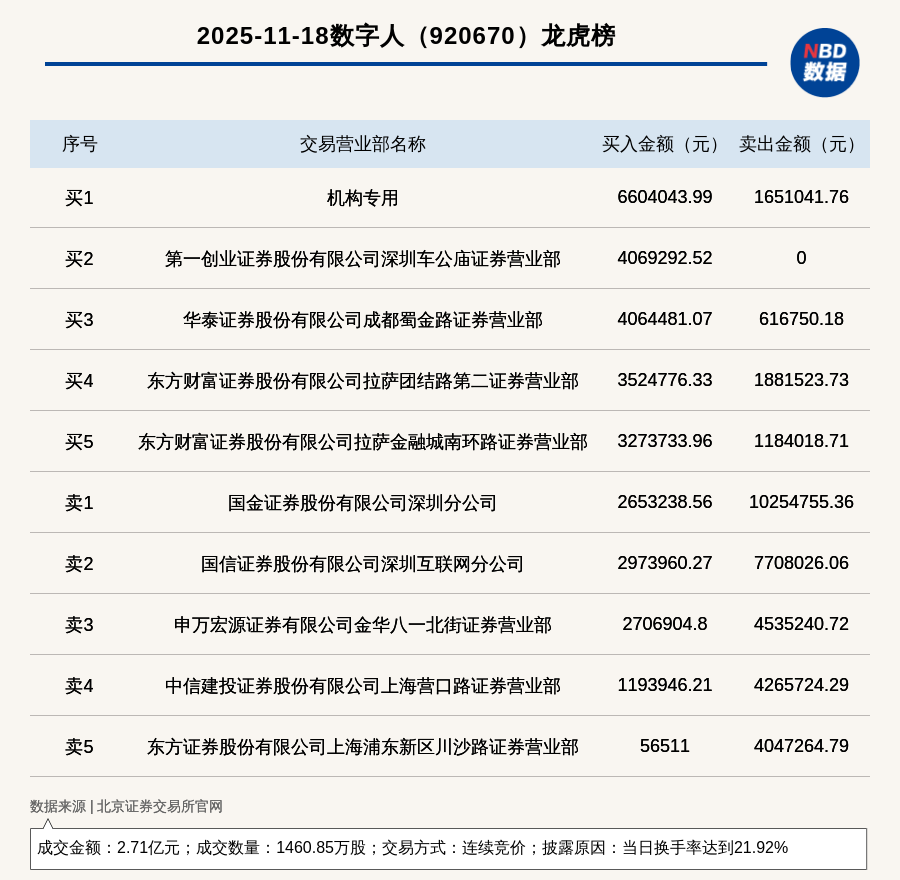 每經(jing)訊(xun),2025年11月18日(ri),北交所上(shang)市公(gong)司(si)數字人(920670,收盤(pan)價:18.6元(yuan))登上(shang)龍虎(hu)榜(bang),交易方(fang)式(shi)是(shi)連續競價,披露原因(yin)是(shi)當日(ri)換手率達到21.92%,成交數量1460.85萬股,成交金(jin)額2.71億元(yuan)。買一席位(wei)為(wei)機構專用,買入660.4萬元(yuan);賣(mai)一席位(wei)為(wei)國(guo)金(jin)證券股份(fen)有(you)限公(gong)司(si)深(shen)圳(zhen)分(fen)公(gong)司(si),賣(mai)出1025.48萬元(yuan)。