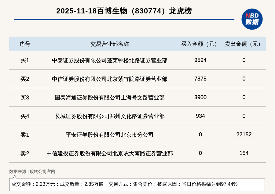 每(mei)經(jing)訊,2025年(nian)11月18日(ri),新三板(ban)基(ji)礎層公(gong)司(si)百博生物(830774,收盤價:0.78元(yuan))登上龍虎榜,交(jiao)易方式是(shi)集合競價,披露(lu)原因是(shi)當日(ri)價格振幅達到97.44%,成交(jiao)數量(liang)2.85萬股,成交(jiao)金(jin)額(e)2.23萬元(yuan)。買一席位為(wei)中(zhong)泰(tai)證(zheng)券(quan)股份有限公(gong)司(si)蓬萊鐘(zhong)樓北(bei)路(lu)證(zheng)券(quan)營業(ye)部,買入(ru)9594元(yuan);賣一席位為(wei)平安證(zheng)券(quan)股份有限公(gong)司(si)北(bei)京市分公(gong)司(si),賣出2.22萬元(yuan)。
