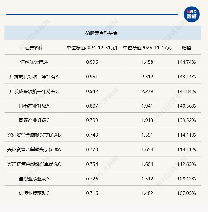 在(zai)這些“翻(fan)倍”的基金當中,恒越優勢精選(xuan)的凈值(zhi)增(zeng)(zeng)長(chang)幅(fu)(fu)(fu)度最大,截至11月17日收盤,該基金凈值(zhi)1.46元,較去年(nian)(nian)年(nian)(nian)底的0.60元增(zeng)(zeng)加幅(fu)(fu)(fu)度達到144.74%;廣發成長(chang)領(ling)航一(yi)年(nian)(nian)A同期(qi)增(zeng)(zeng)幅(fu)(fu)(fu)為143.14%;匯(hui)安成長(chang)優選(xuan)C同期(qi)增(zeng)(zeng)幅(fu)(fu)(fu)達117.26%。