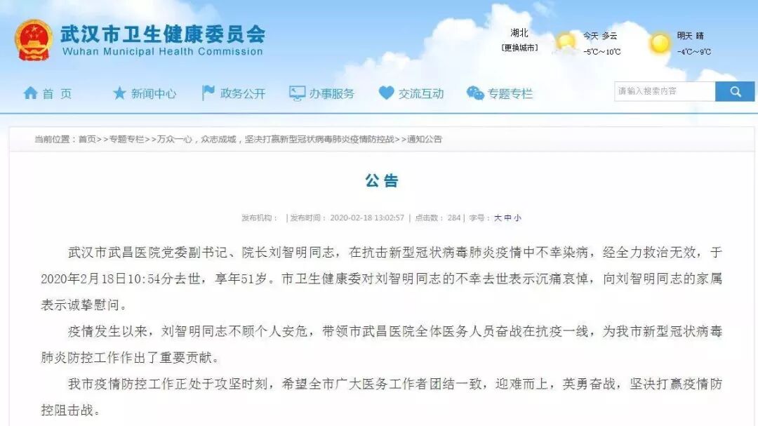 今天上午,武漢武昌醫院院長劉智明因感染新冠肺炎不幸去世。