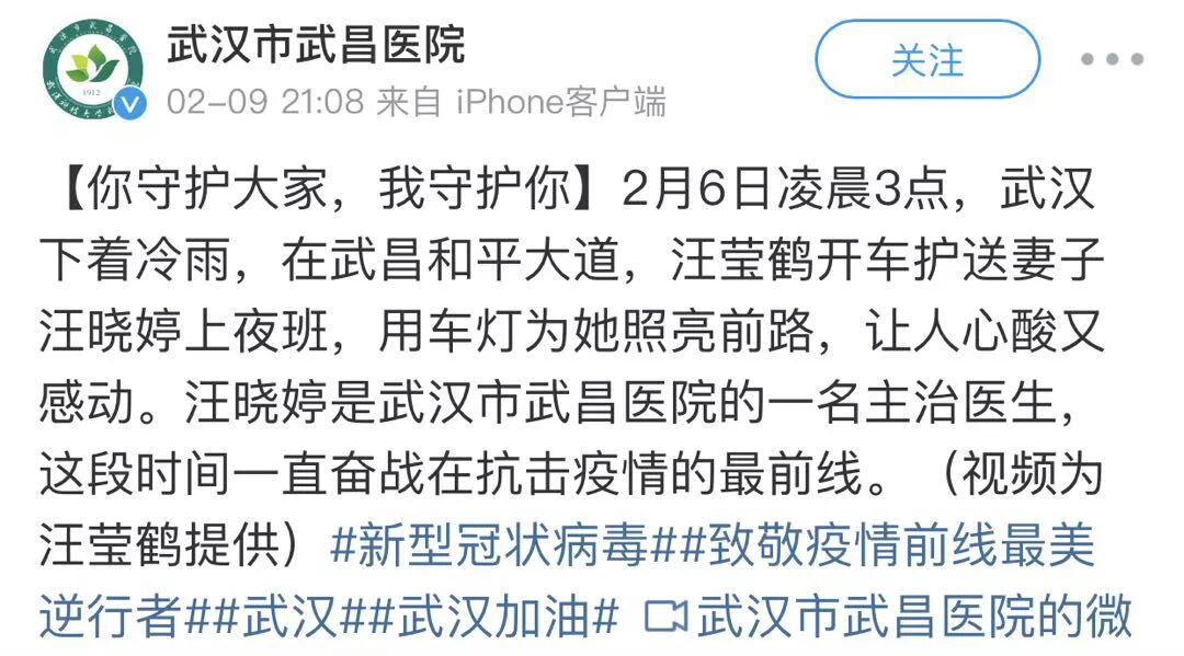 2月9日,武昌醫院發布一條微博,配文“你守護大家,我守護你”。