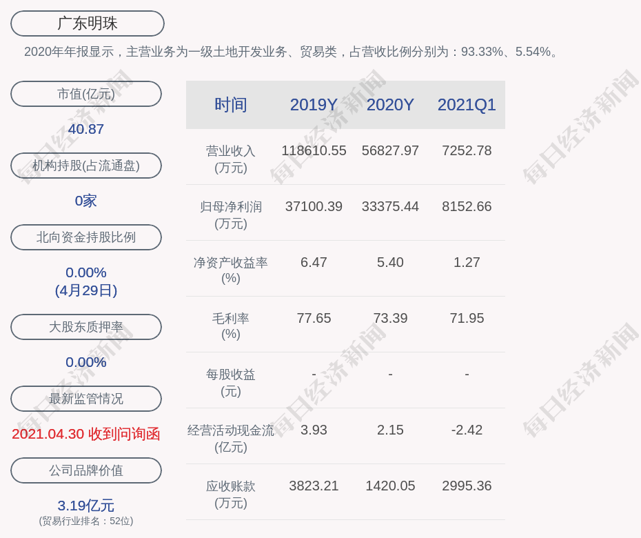2020年年報顯示,廣東明珠的主營業務為一級土地開發業務、貿易類,占營收比例分別為:93.33%、5.54%。
