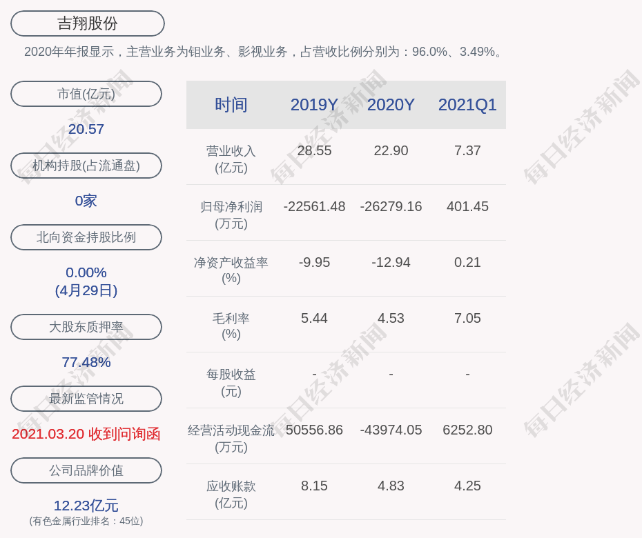 2020年年報顯示,吉翔股份的主營業務為鉬業務、影視業務,占營收比例分別為:96.0%、3.49%。