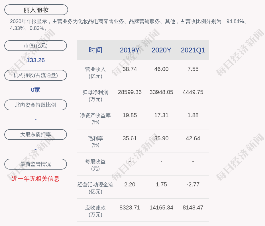 2020年年報顯示,麗人麗妝的主營業務為化妝品電商零售業務、品牌營銷服務、其他,占營收比例分別為:94.84%、4.33%、0.83%。