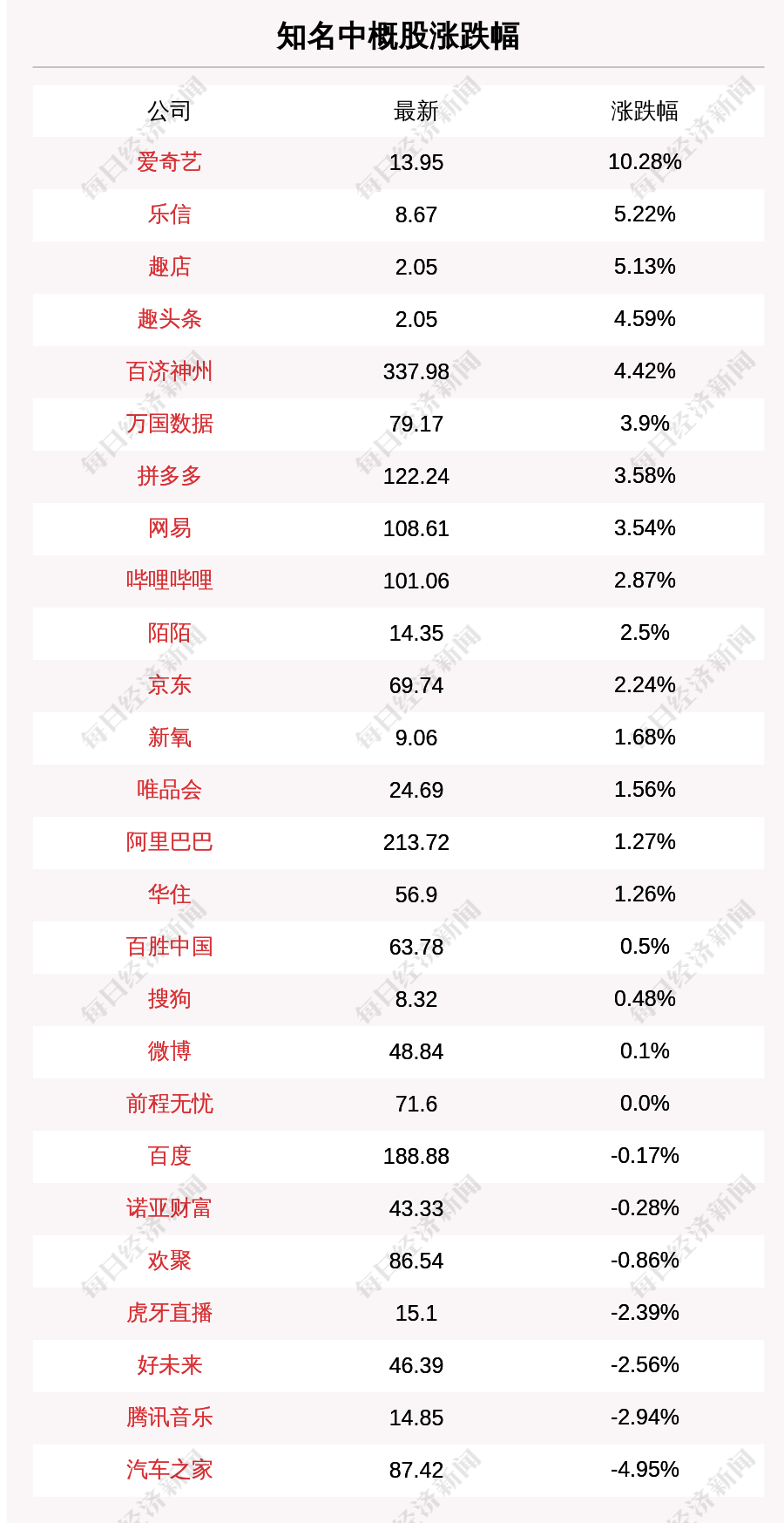 每經AI快訊:北京時間5月19日05:30,知名中概股中愛奇藝、樂信、趣店、趣頭條、百濟神州漲幅居前,收盤分別上漲10.28%、5.22%、5.13%、4.59%、4.42%。汽車之家、騰訊音樂、好未來、虎牙直播、歡聚跌幅居前,收盤分別下跌4.95%、2.94%、2.56%、2.39%、0.86%。
