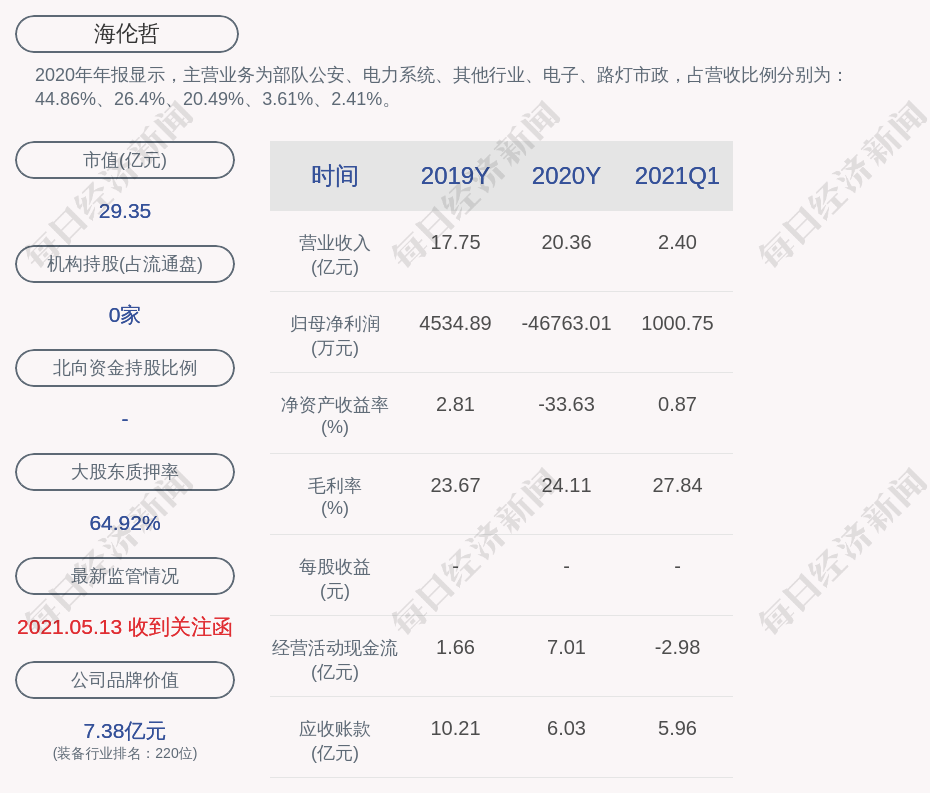 2020年年報顯示,海倫哲的主營業務為部隊公安、電力系統、其他行業、電子、路燈市政,占營收比例分別為:44.86%、26.4%、20.49%、3.61%、2.41%。