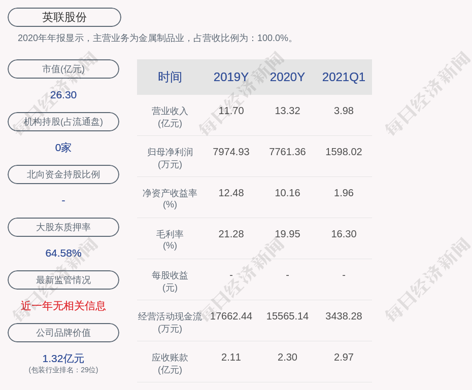 2020年年報顯示,英聯股份的主營業務為金屬制品業,占營收比例為:100.0%。