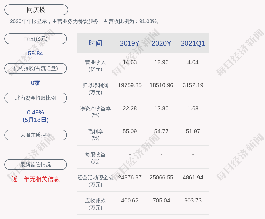2020年年報顯示,同慶樓的主營業務為餐飲服務,占營收比例為:91.08%。