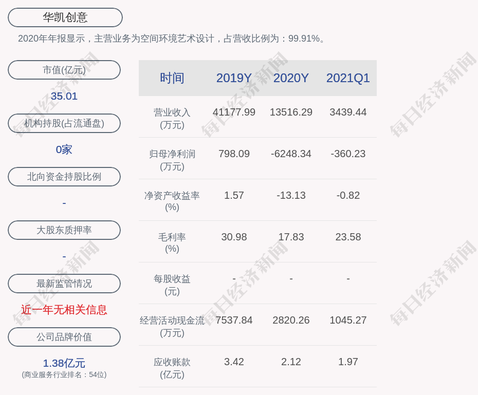 2020年年報顯示,華凱創意的主營業務為空間環境藝術設計,占營收比例為:99.91%。