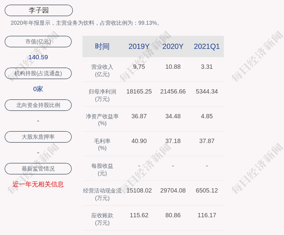 2020年年報顯示,李子園的主營業務為飲料,占營收比例為:99.13%。