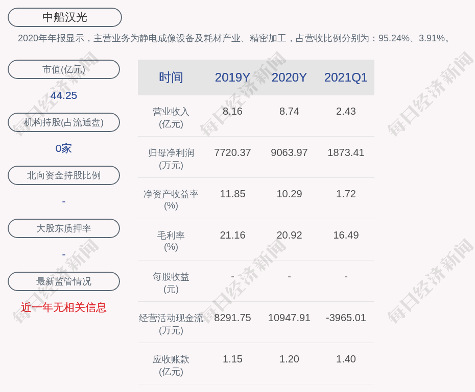2020年年報顯示,中船漢光的主營業務為靜電成像設備及耗材產業、精密加工,占營收比例分別為:95.24%、3.91%。