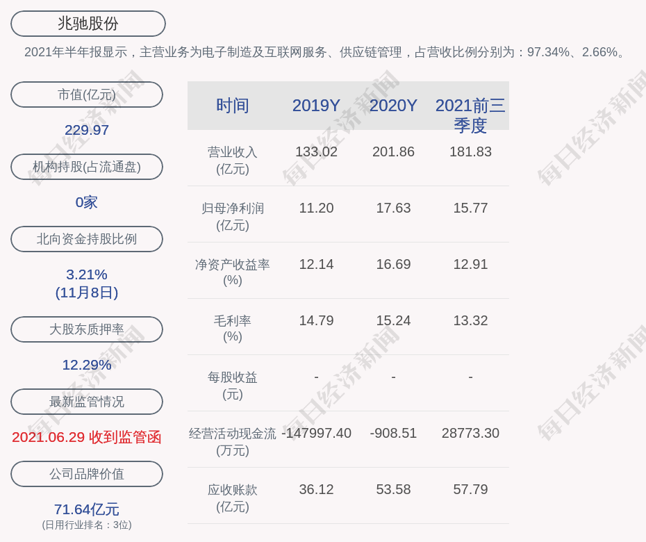 2021年半年報顯示,兆馳股份的主營業務為電子制造及互聯網服務、供應鏈管理,占營收比例分別為:97.34%、2.66%。