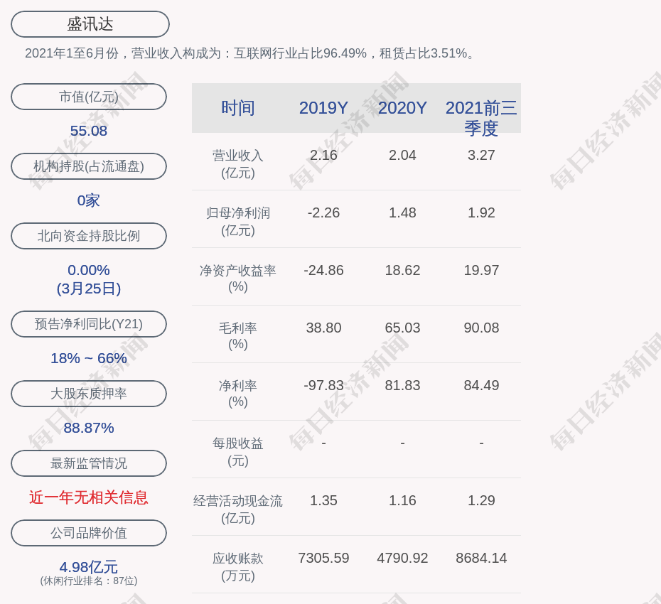 2021年1至6月份,盛訊達的營業收入構成為:互聯網行業占比96.49%,租賃占比3.51%。