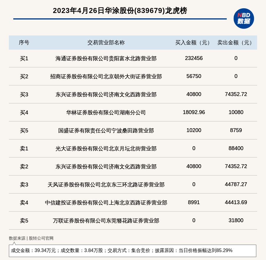 每經訊,2023年4月26日,新三板創新層公司華涂股份(839679)登上龍虎榜,交易方式是集合競價,披露原因是當日價格振幅達到85.29%,成交數量3.84萬股,成交金額39.34萬元。買一席位為海通證券股份有限公司貴陽富水北路營業部,買入23.25萬元;賣一席位為光大證券股份有限公司北京月壇北街營業部,賣出8.84萬元。